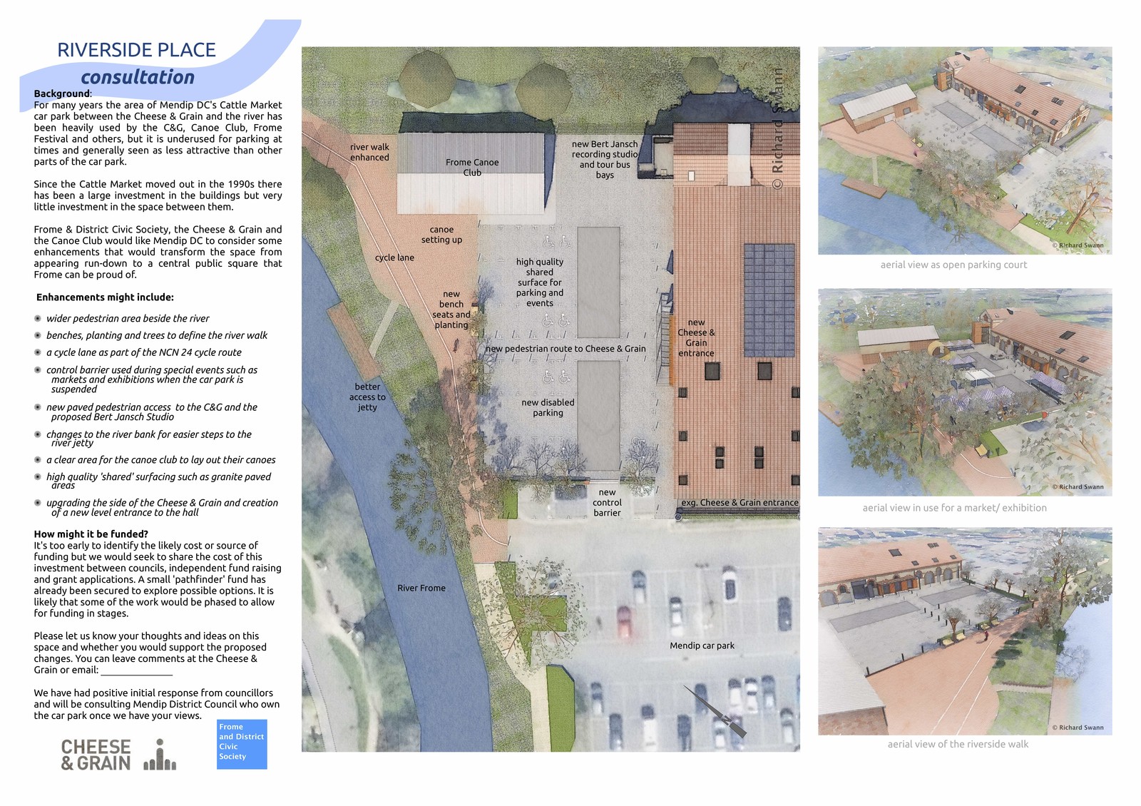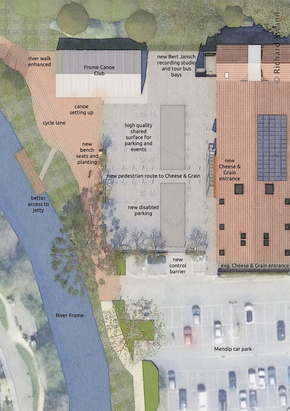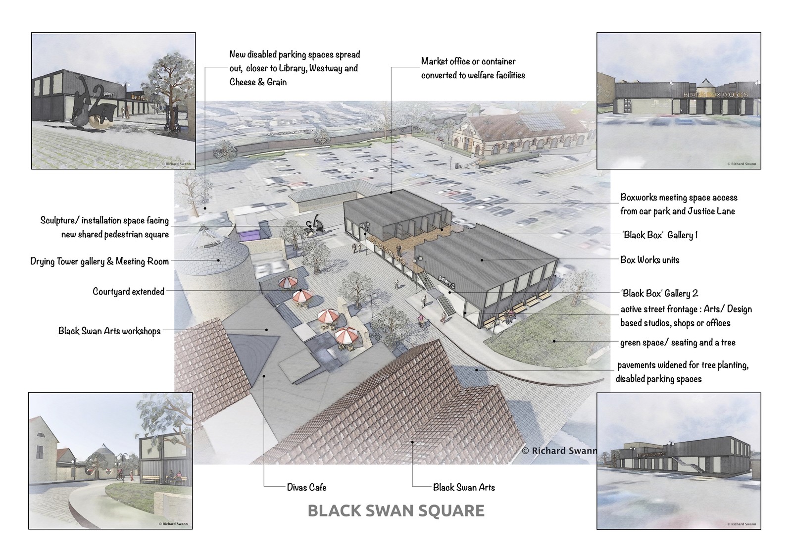 More recently studies have been undertaken by the practice to identify two areas where enhancements would help adjacent facilities at the Cheese & Grain and the Black Swan Arts through place making. See images on the right.