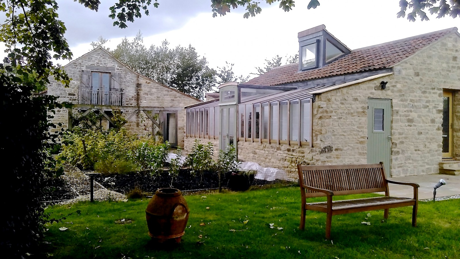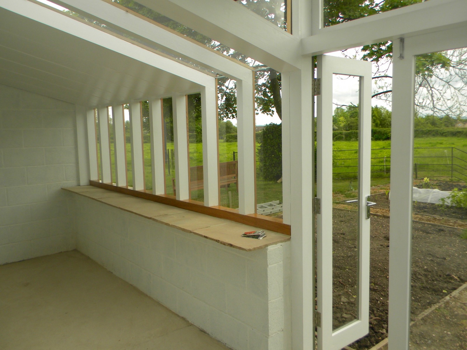 A 'Janus' garden building facing two ways, a different face and function for each of the owners, a music room for him to hold a collection of several thousand CDs, and a sunny gardening room and potting shed for her. The garden pavilion straddles an old stone wall, facing an existing formal potager to the south and open meadows to the north.