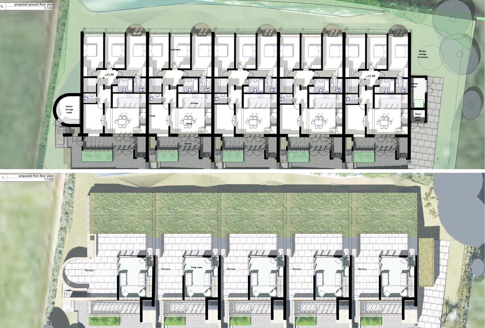 An edge of town site for five innovative ecohouses. The design maximises the southerly aspect with a zero-carbon approach to materials selection. The scheme continues the contours of the escarpment to create a rural edge to the town.