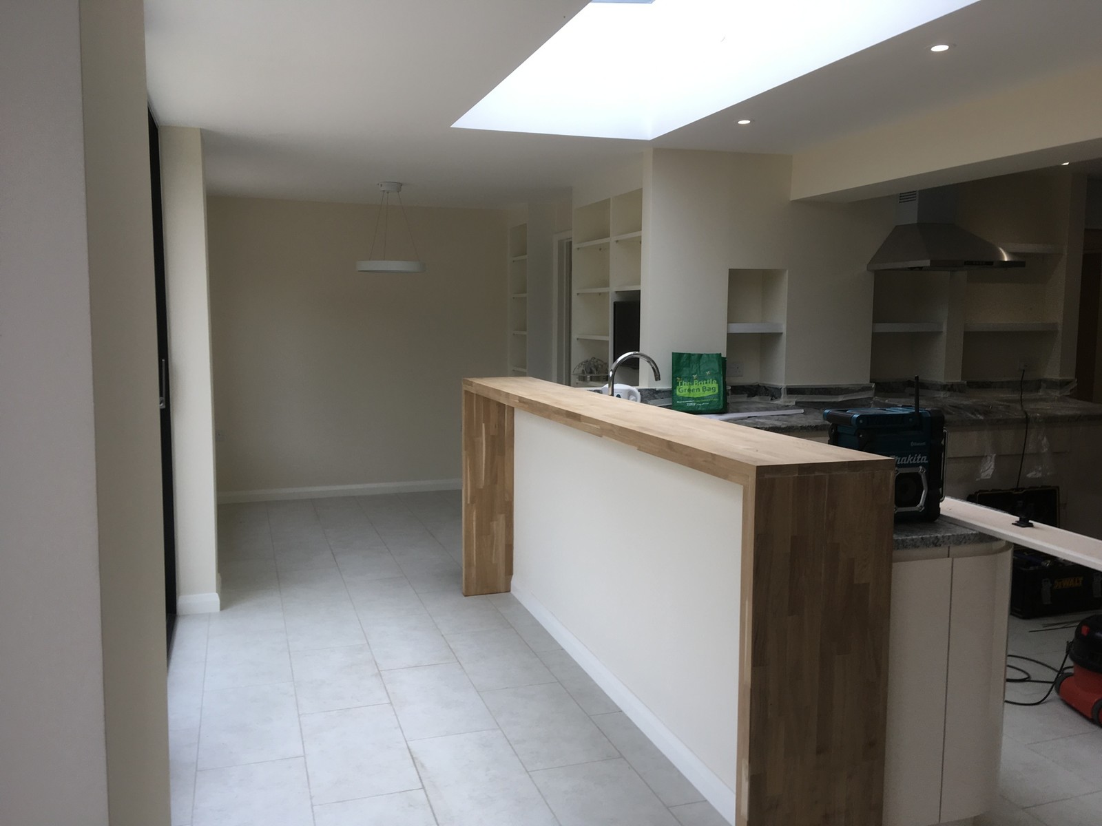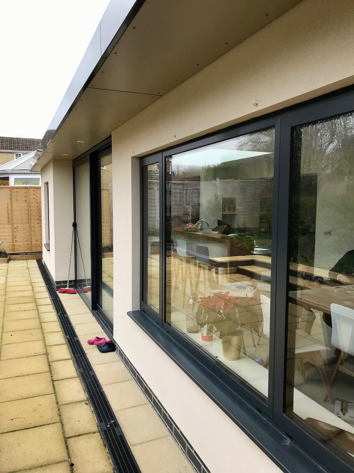 This 1970's estate home was too cramped for the growing family. After exploring several options for extending the ground floor and bedrooms, the back of the house was opened up to create a large open family room with dining area, kitchen and living room, a new cloakroom with shower and adequate coat and boot store. What a transformation!