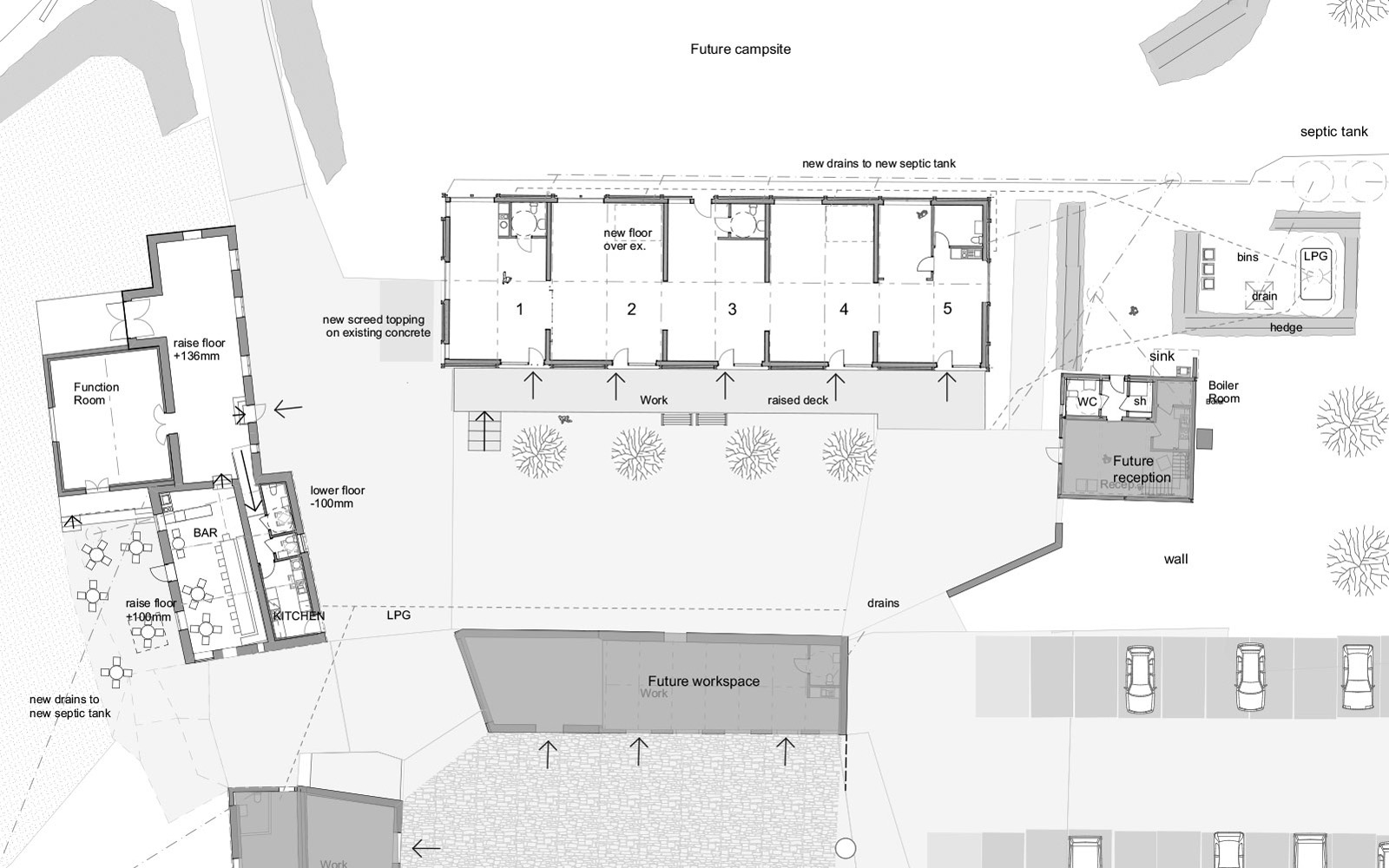 We investigated a mixed-use for the site, with glamping (via license), community spaces, offices to rent, a museum & restoration of all the original farm buildings. The long term plan was for a rural retreat. These proposals would provide a flexibility of uses to allow the business to grow & change.