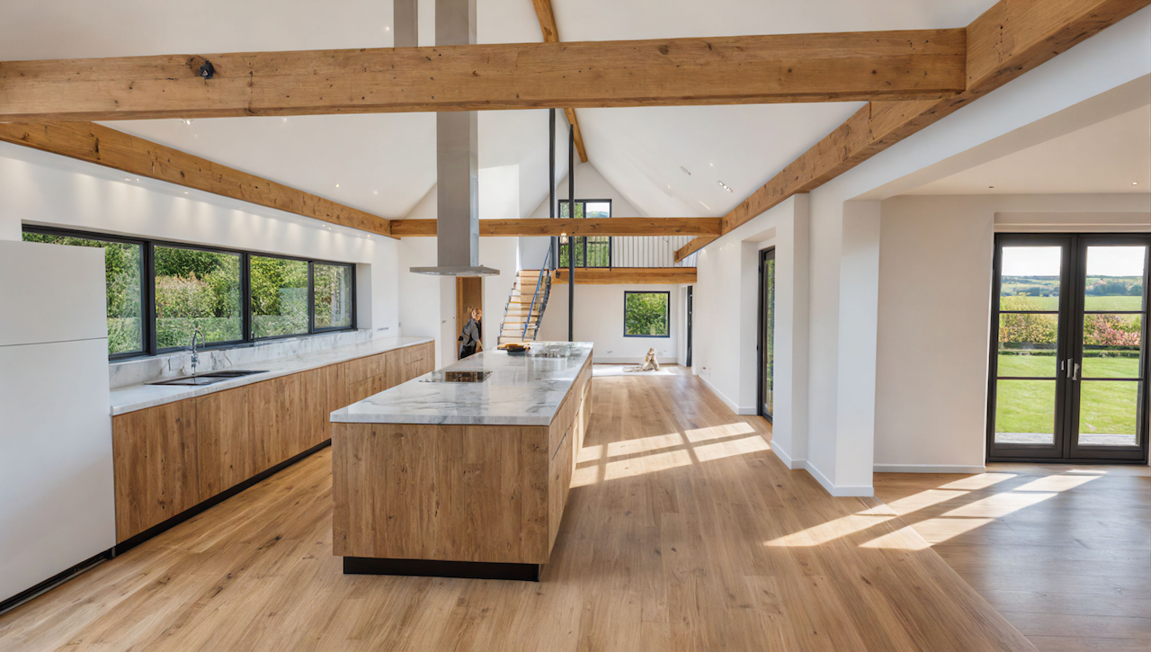 A new contemporary wing creates a welcoming covered entrance and forecourt. The extension accommodates a large open-plan family kitchen, dining room, play area, gallery, sitting room snug, with a first floor study over. It also connects to a highly renovated workshop and garage, converted to provide a guest wing. The entire project was built and managed by the owners, while living on site with their growing family, a triumph of their many skills!