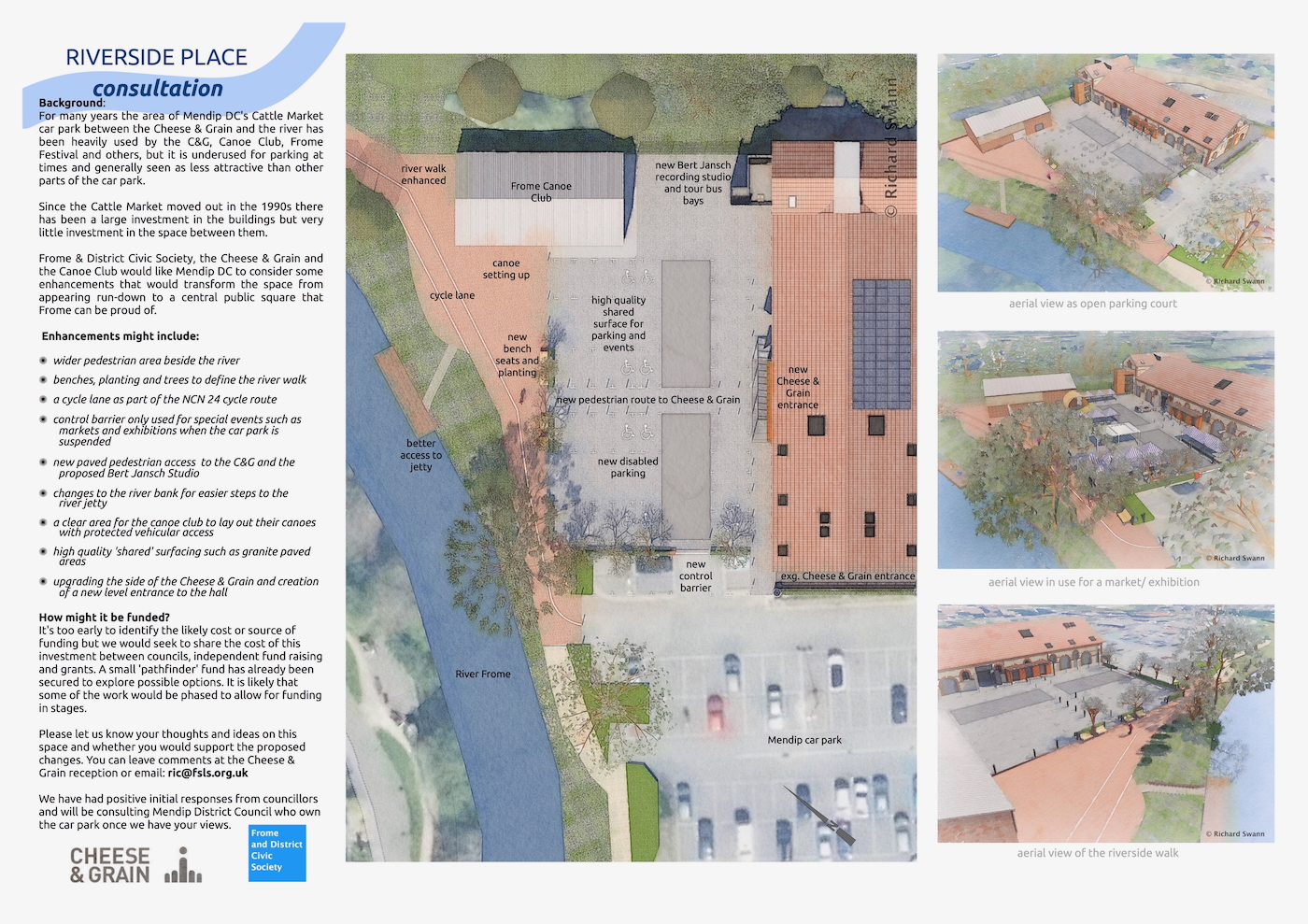 The proposals build on the success of previous projects with the Cheese & Grain and our earlier proposals for the wider regeneration to create a Riverside Place and Black Swan Square . We were commissioned to develop a concept for providing new rehearsal space and post-production editing suites to complement the Bert Jansch recording Studio. The site is located at the back of an unpromising public car park, backing onto a live mineral railway. We developed a contextual design that connects the building visually with the Cheese and Grain and provides an additional entrance for the venue. With detailed Planning permission achieved, Event Tec are now looking forward to completing the technical design.