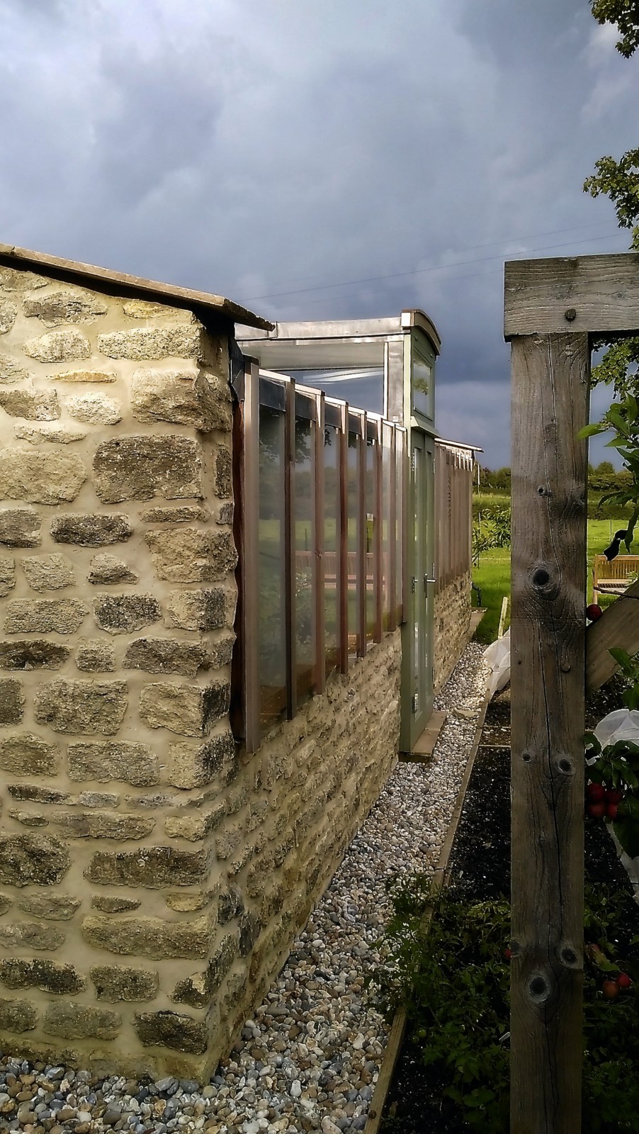 A 'Janus' garden building facing two ways, a different face and function for each of the owners, a music room for him to hold a collection of several thousand CDs, and a sunny gardening room and potting shed for her. The garden pavilion straddles an old stone wall, facing an existing formal potager to the south and open meadows to the north.