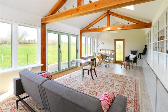 The pavilion uses rubble stone and cedar walls with a re-used clay tiled roof. This harmoniously co-exists with the main listed house (a previous project), while creating a distinct and appropriate modern pavilion. A south facing roof lantern lights the north facing music room throughout the day.