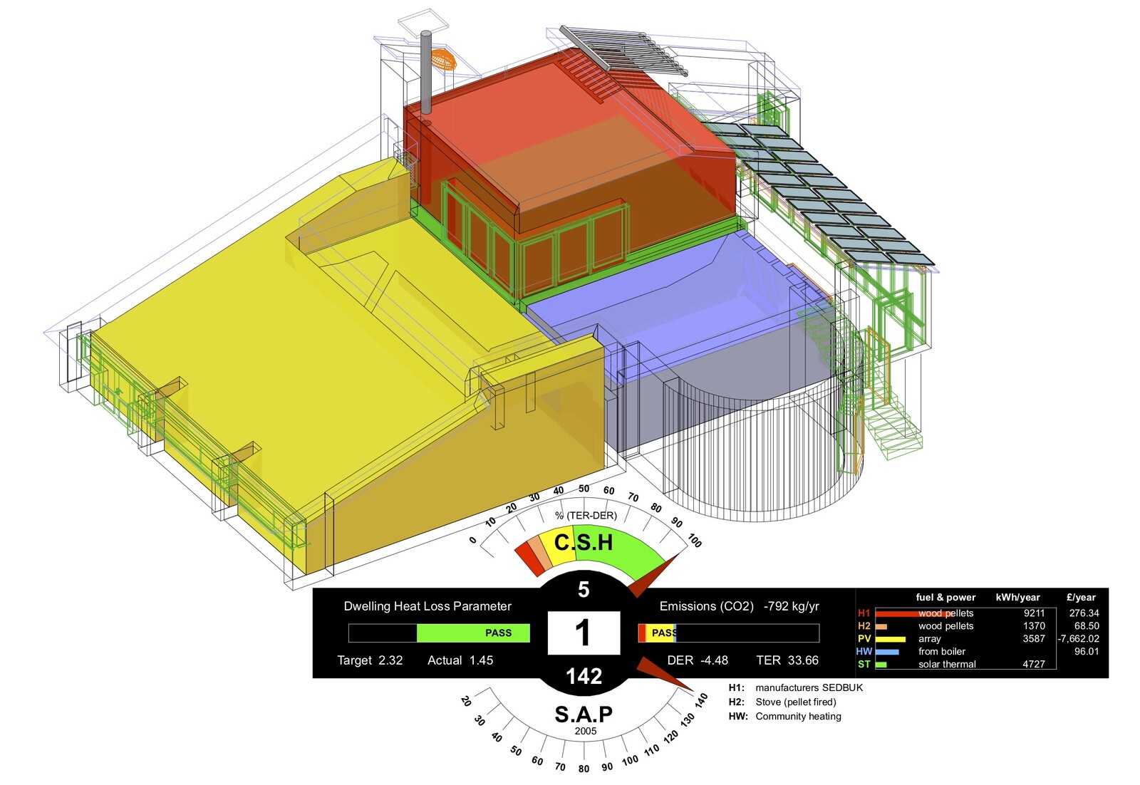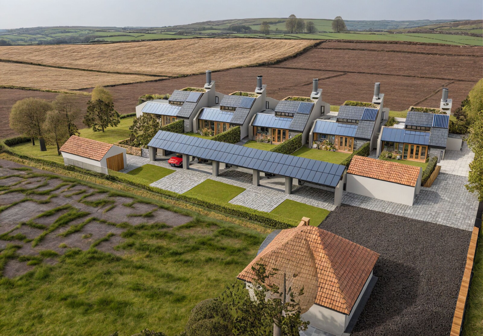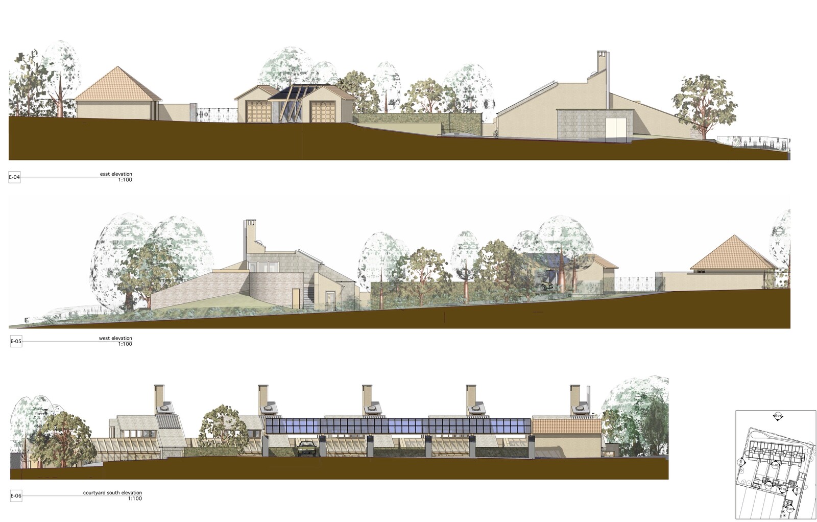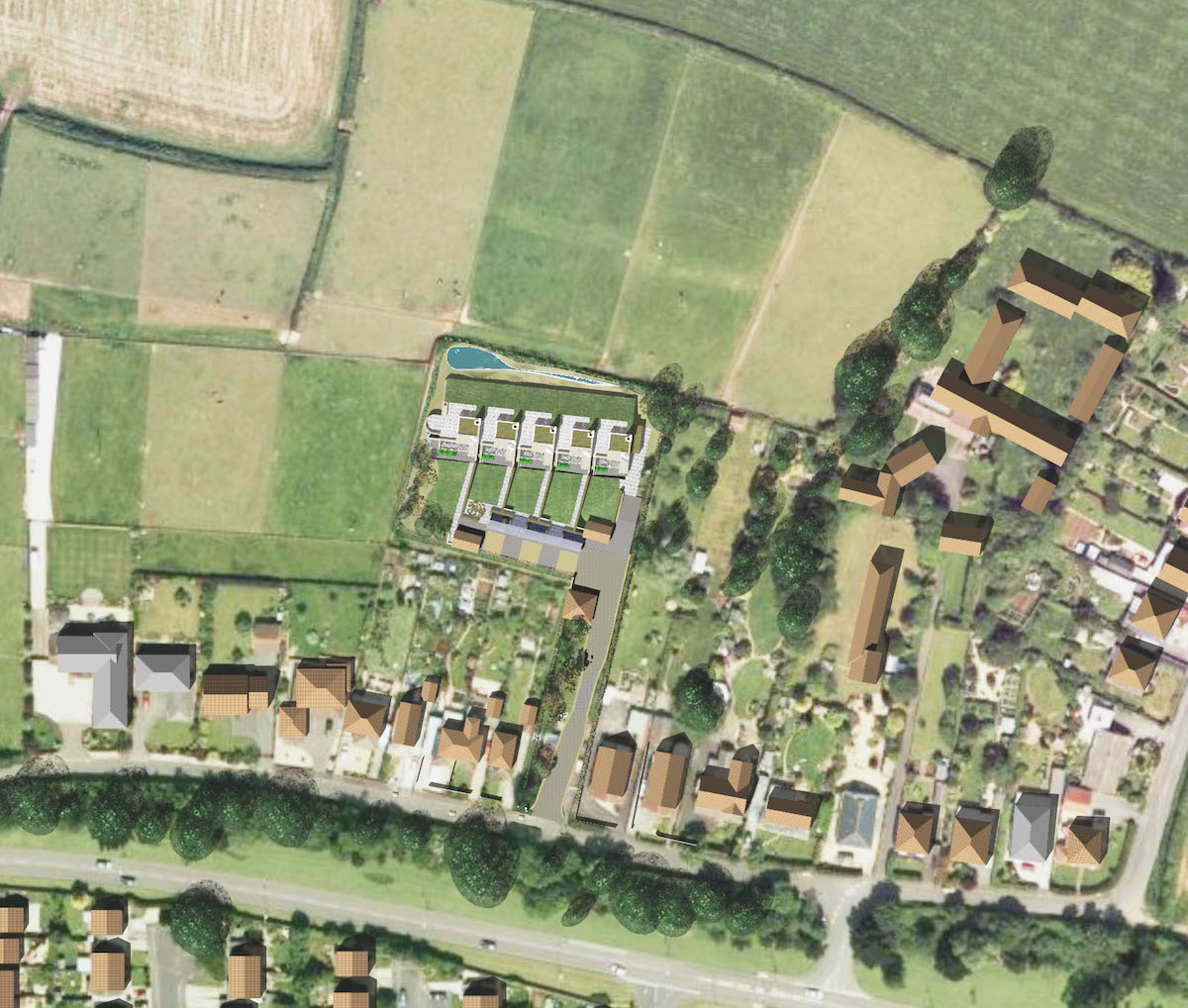 An edge of town site for five innovative ecohouses. The design maximises the southerly aspect with a zero-carbon approach to materials selection. The scheme continues the contours of the escarpment to create a rural edge to the town.