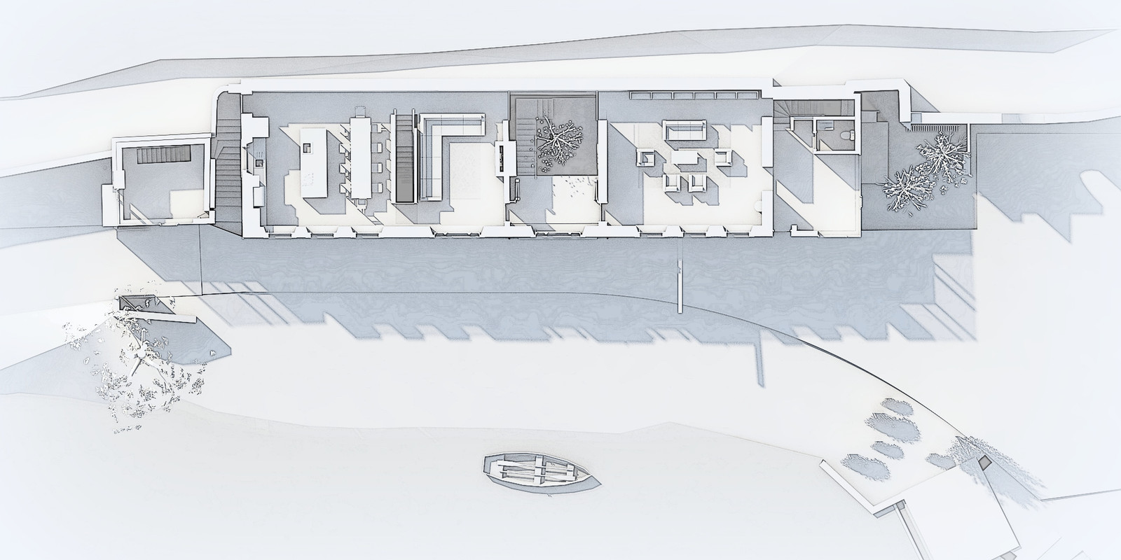 Our approach fully restores the main building, while treating flanking ruins 'as found', with contemporary extensions overlooking the river and approach. The house has an upside down arrangement of open plan first floor living spaces, making the most of the daylight and views in the steep sided wooded valley.