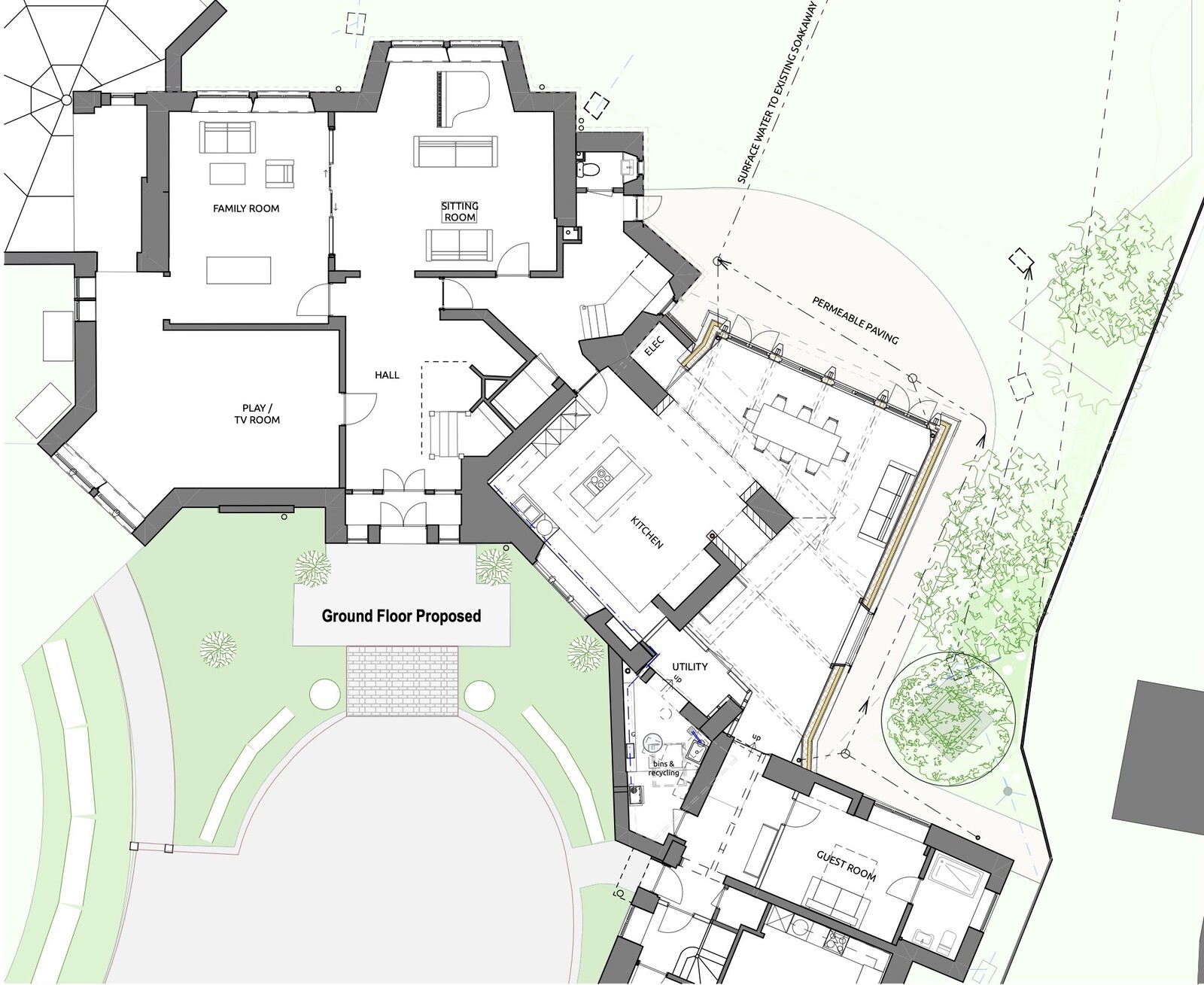 An imposing Country House with a chequered history, was in need of some rethinking. Previous use as a Hotel with the strap line sign 'Sleep with Us' has left the building with a hangover. Our clients wanted to bring the building back into use as a comfortable family home, without the excessive en-suites, commercial kitchens, regulation hotel fire doors and external fire escape stair.