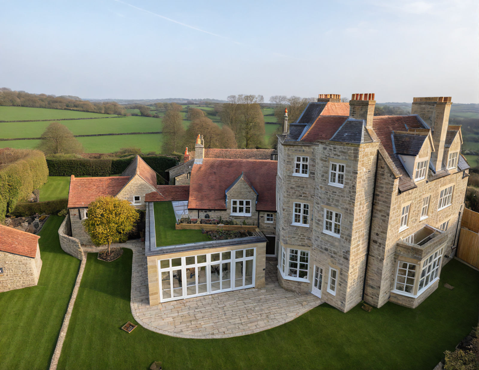 We advised on the internal alterations and achieved planning consent to reconfigure the kitchen, and partly demolish and extend a neglected 19th century laundry, to make a warm and sunny open-plan kitchen and dining area, linking an existing guest wing. The extension takes its cue from the strong architectural style and scale of the main house, while maintaining a contemporary feel.
